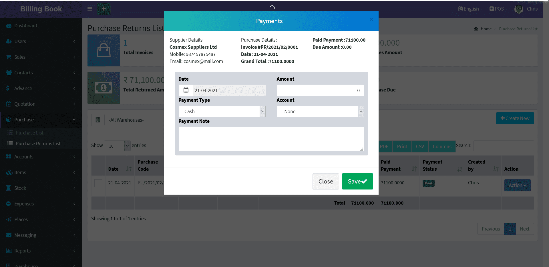 Reports -> Purchase Return Report