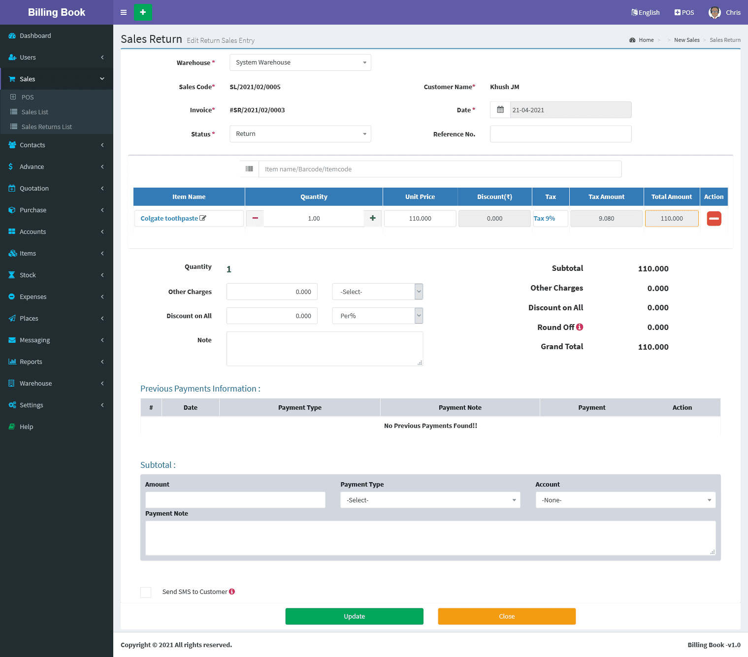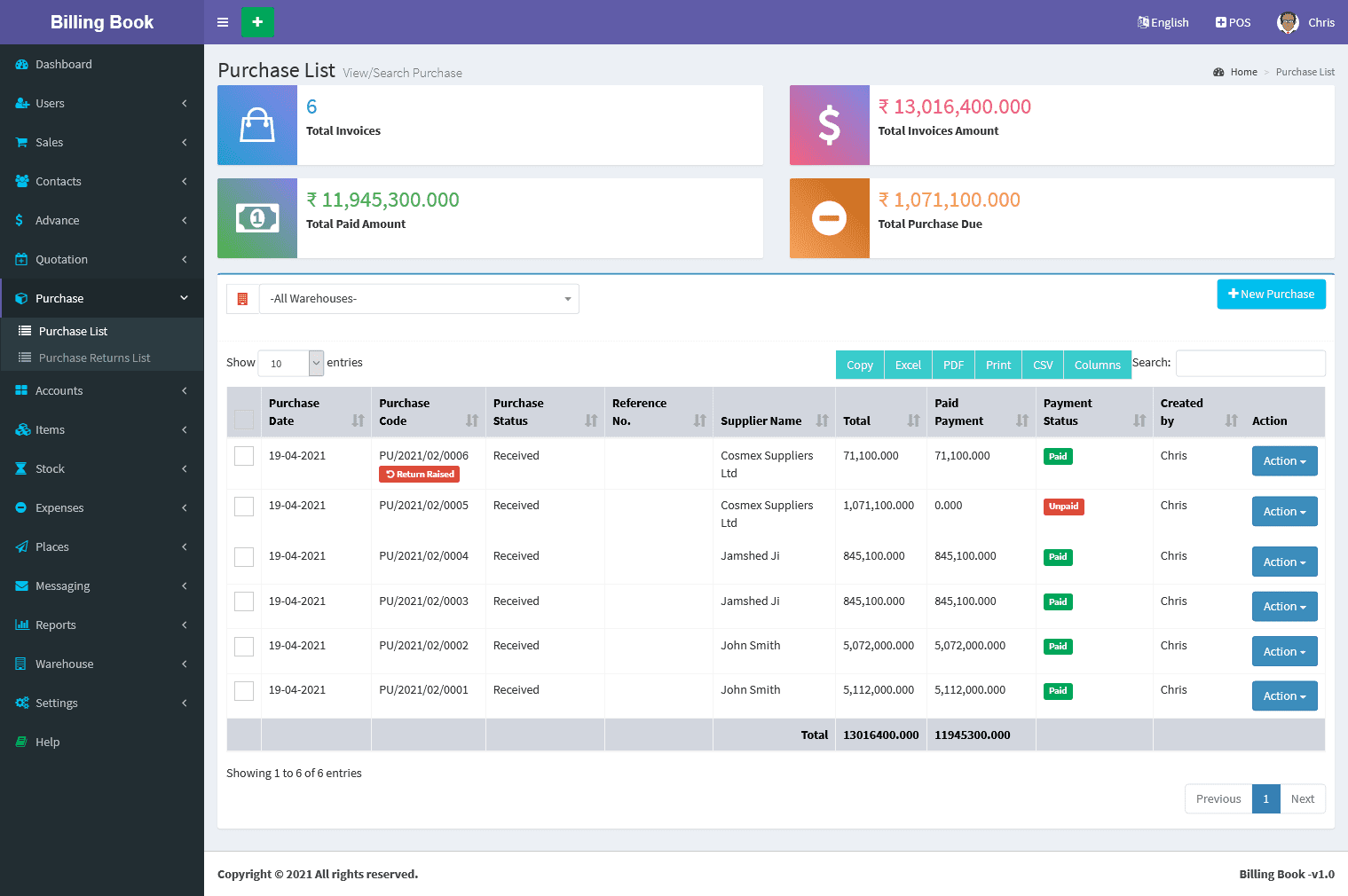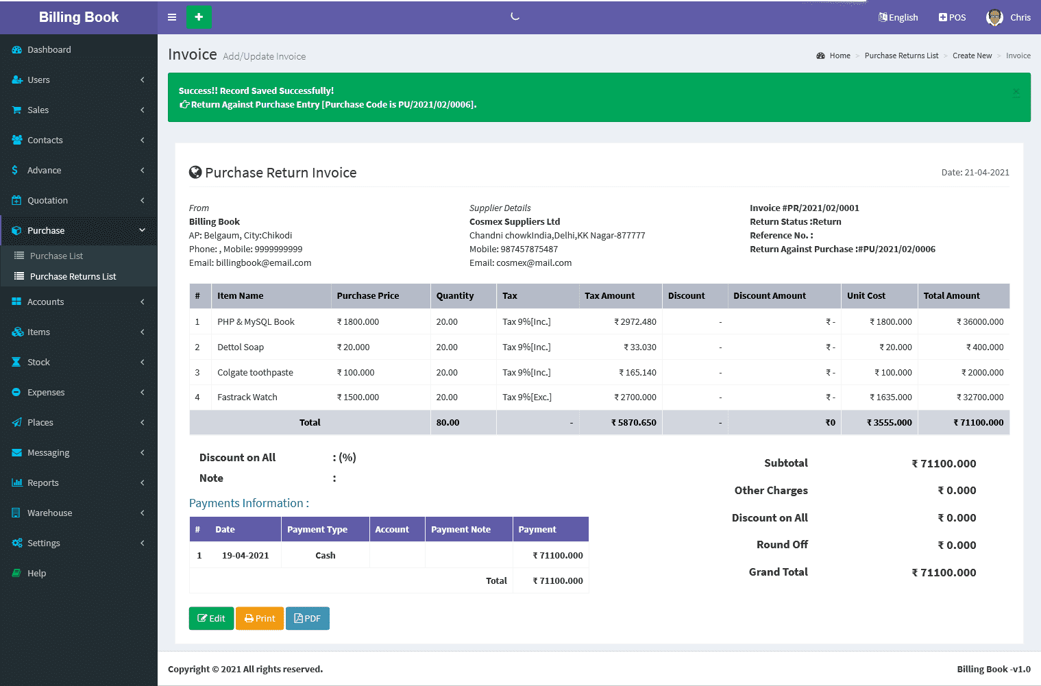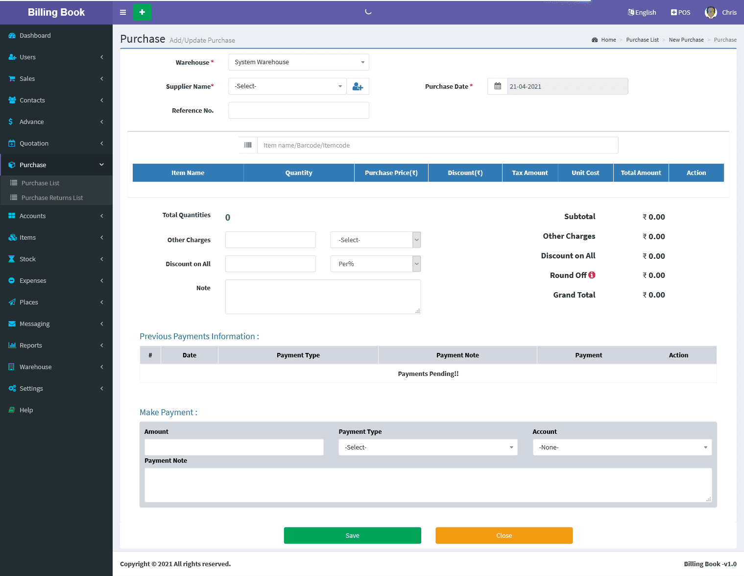 Billing Book is a PHP based web application software, where user can track and manage Items & Stock, Suppliers, Customers, Items Categories, Sales Invoice, Purchase Invoice, users and get all the reports which are require to your office with many more features. You can create any number of Warehouses and Users.