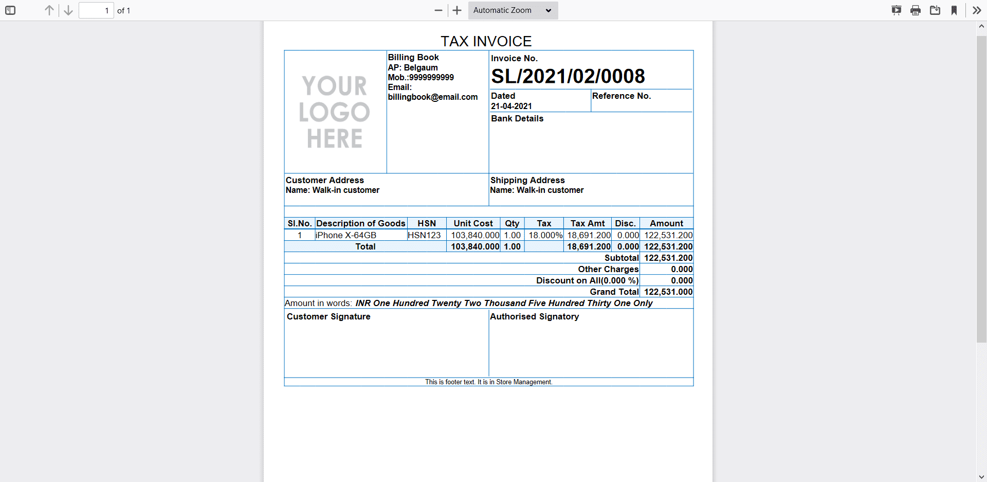 You can update the store profile information's like Store name, Phone, Mobile, Email, GST Number, VAT Number, PAN Number, Bank Details, Website link, Country, State, Postcode,Address and Invoice Logo.
